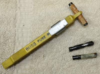 A several YouTubers suggested that after 60+ years it is a time to remove the tarnish from glass fuse contacts. They had several recommendations as to how to go about it. All seemed awkward and a bit destructive. I came up with what I consider a better way. If you are like me, you have many dozen if not hundreds of drill bits laying around. Sacrifice one that is a little smaller than ¼ inch. Cut it into lengths of 0.75, 1.0 and 1.25 inches. These are the lengths of the tube fuses. Wrap the three bit fragments with 120 grit sandpaper. Use your tube fuse installer tool to hold the sandpaper to the bits. Then just insert the bits into the fuse slots and twist away. Presto, the contacts are shiny clean as new. I can’t remember now if this stopped the fuses from blowing. In any case the brake and right front blinker and brake lights did not work. So, my quest continues.